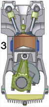 3. Takt, Arbeiten: Das verbrannte Gas hat einen höheren Druck als das verdichtete, so dass beim Arbeitstakt mechanische