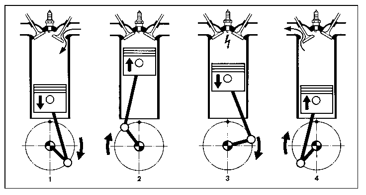 Kolben beim Otto-Motor mit Vergaser oder in- direkter Benzineinspritzung nahe am oberen Totpunkt angelangt, wird die Zündkerze gezündet; beim Direktein- spritzer wird kurz zuvor der Kraftstoff eingespritzt.